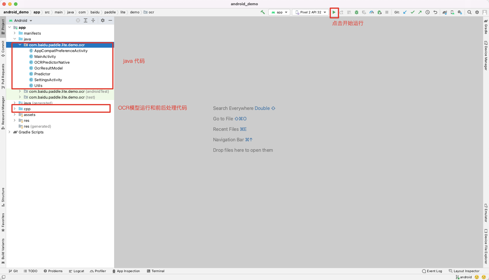 注意:如果您的 Android Studio 尚未配置 NDK ,请根据 Android Studio 用户指南中的安装及配置 NDK 和 CMake内容,预先配置好 NDK 。您可以选择最新的 NDK 版本,或者使用 Paddle Lite 预测库版本一样的 NDK