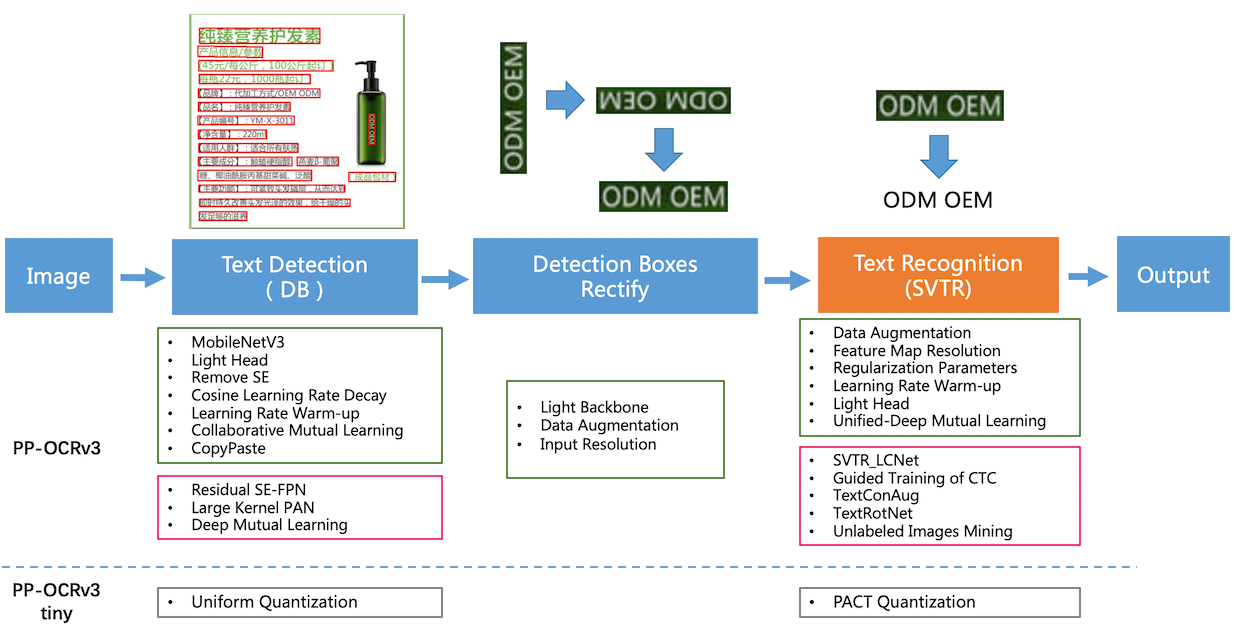 • 超轻量PP-OCRv3系列:检测(3.6M)+ 方向分类器(1.4M)+ 识别(12M)= 17.0M