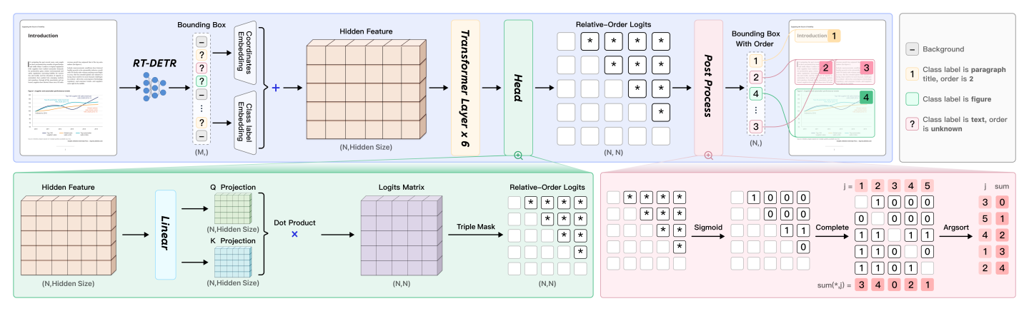 As shown in the figure above, PP-DocLayoutV2 embeds the targets detected by RT-DETR using absolute 2D positional encoding and class labels. Additionally, the pointer network’s attention mechanism incorporates the geometric bias mechanism from Relation-DETR to explicitly model pairwise geometric relationships between elements. The pairwise relation head linearly projects element representations into query and key vectors, then computes bilinear similarities to generate pairwise logits, ultimately producing an N×N matrix representing the relative order between every pair of elements. Finally, a deterministic "win-accumulation" decoding algorithm restores a topologically consistent reading order for the detected layout elements.